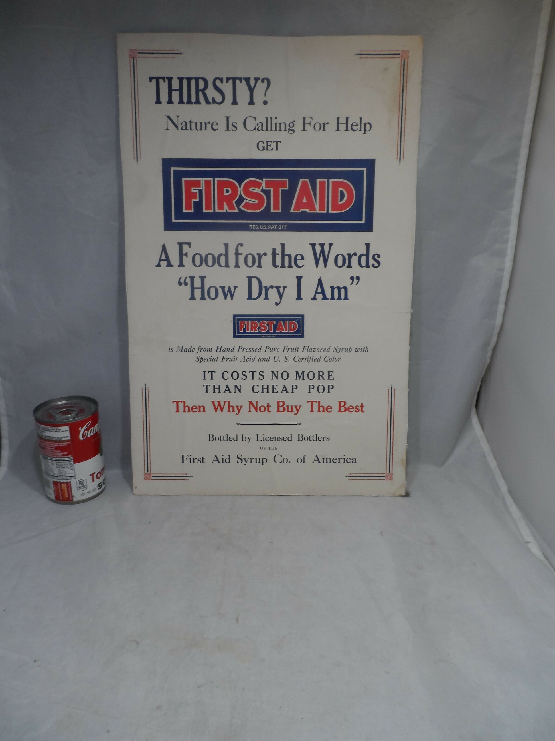 Here is a great original First Aid soda advertising piece that is of thin paper and has been mounted on whiteboard ready for framing. It is approx. 12" x 19" in size. It does have some slight soiling around the edges mainly in the upper right corner.